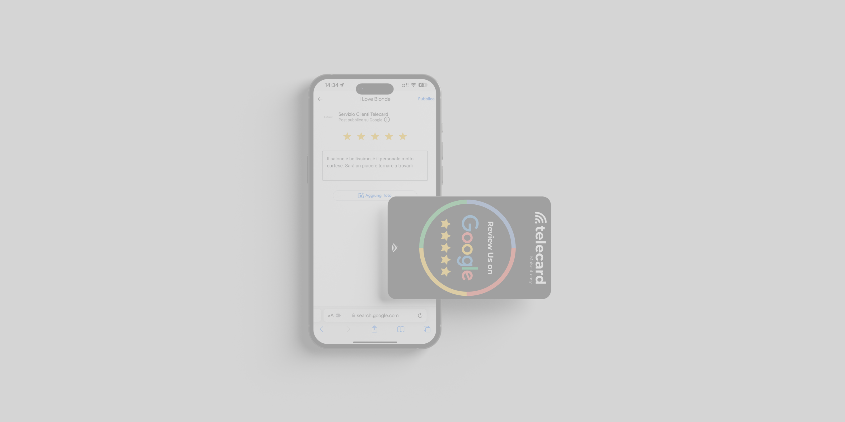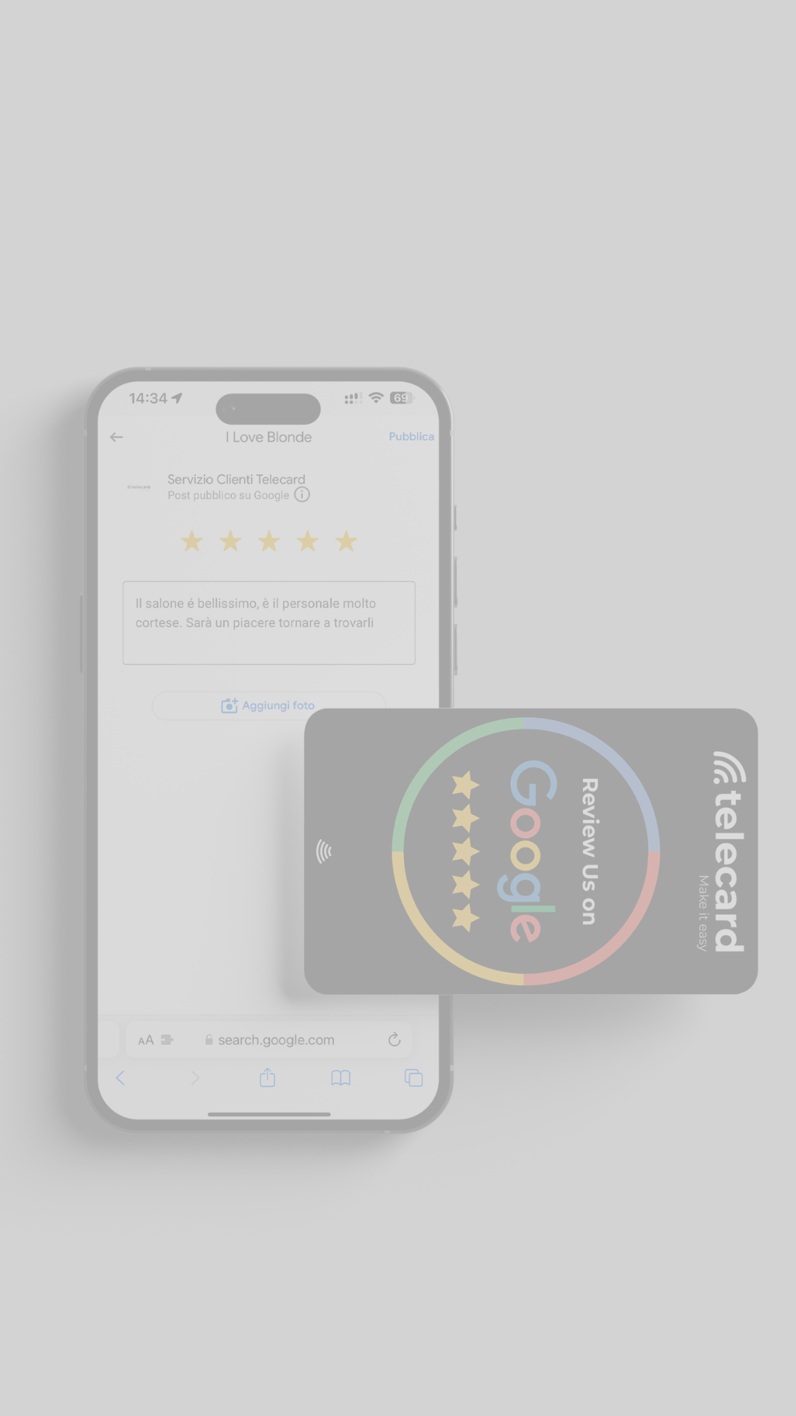 Basta che il cliente appoggi lo smartphone a Telecard e in pochi secondi verrà automaticamente reindirizzato alla tua Pagina Recensioni Google, dove potrà lasciare la sua opinione.